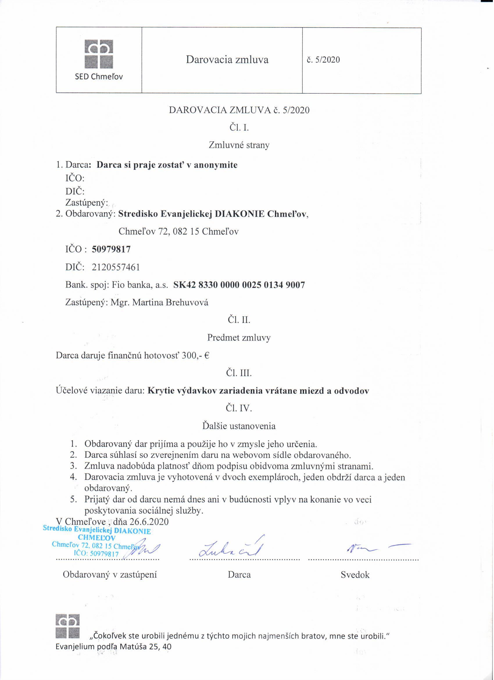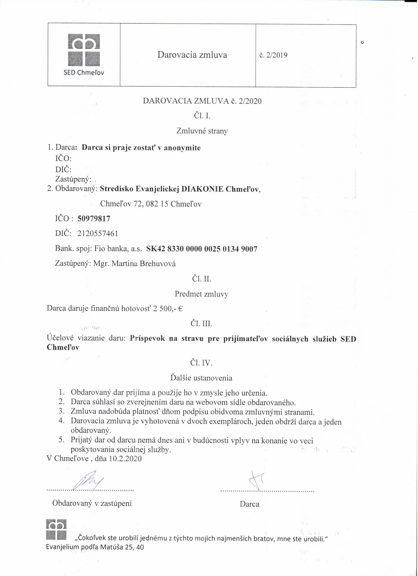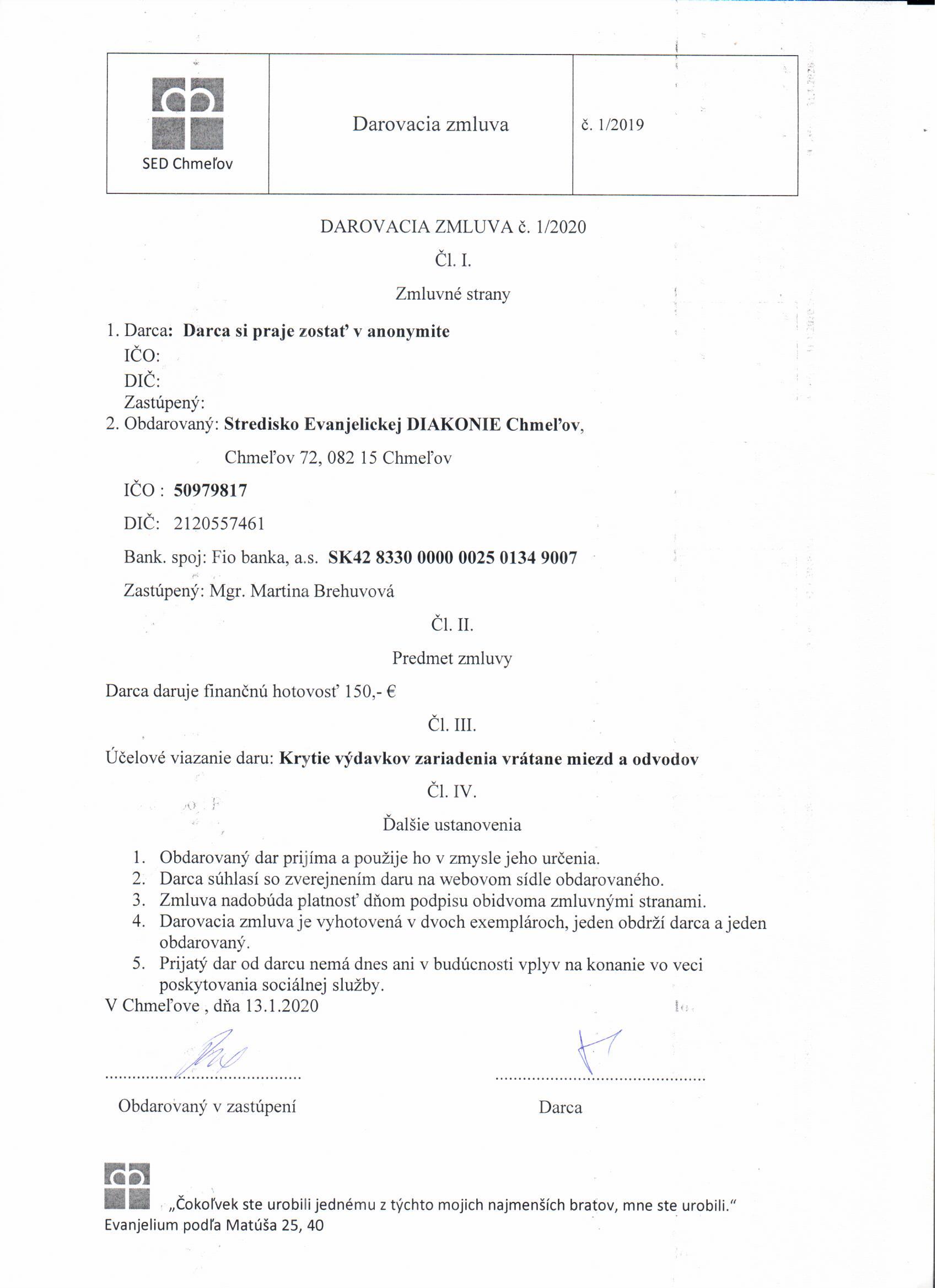 Darovacia zmluva 1/2022 - príspevok na stravu pre PSS