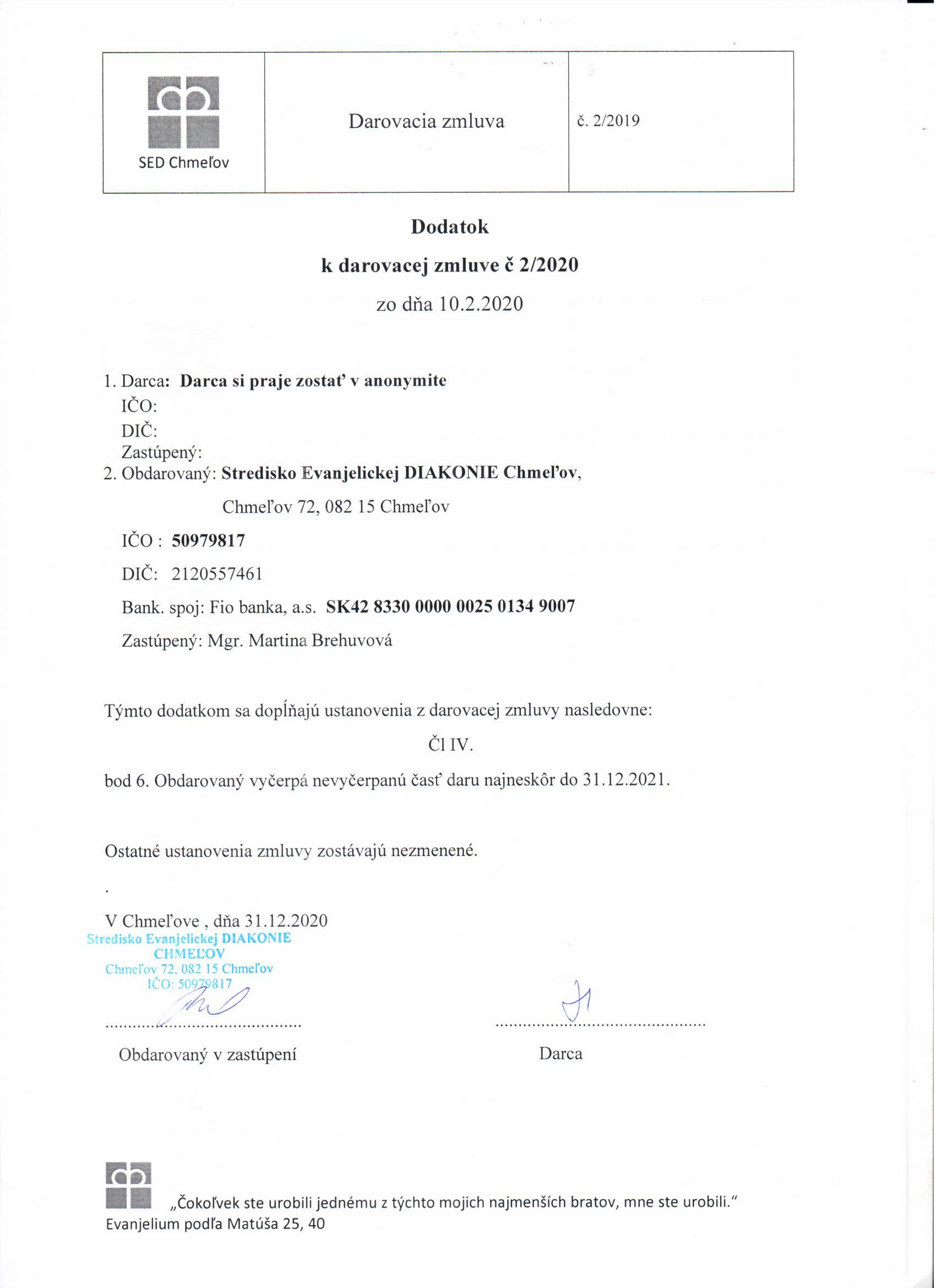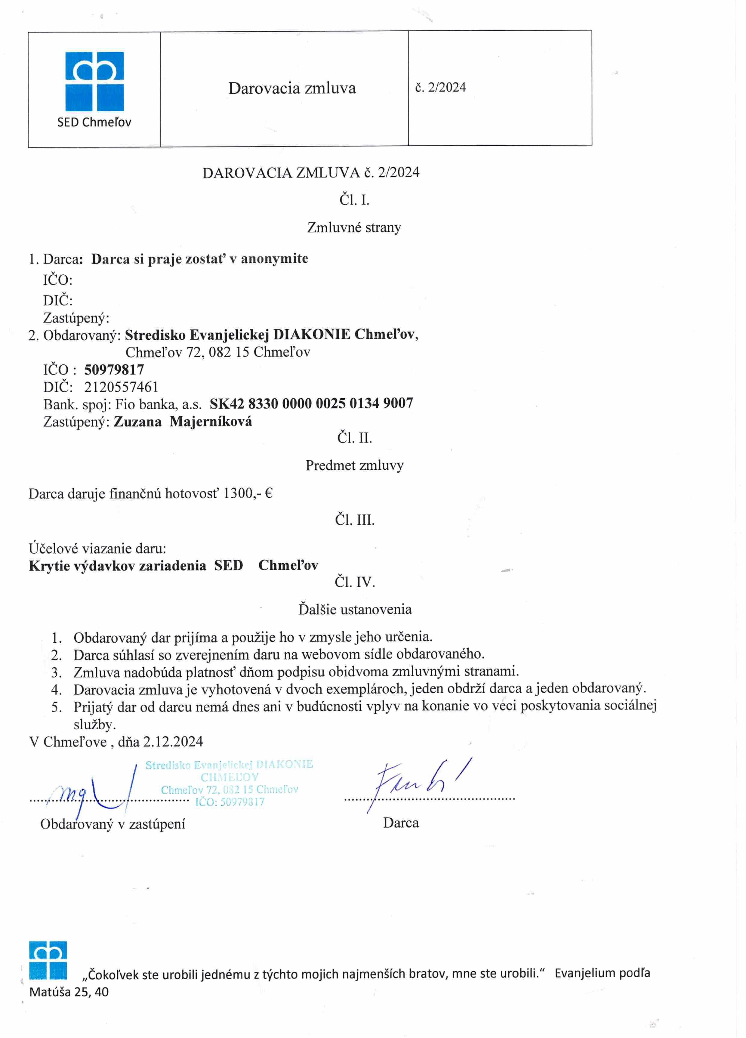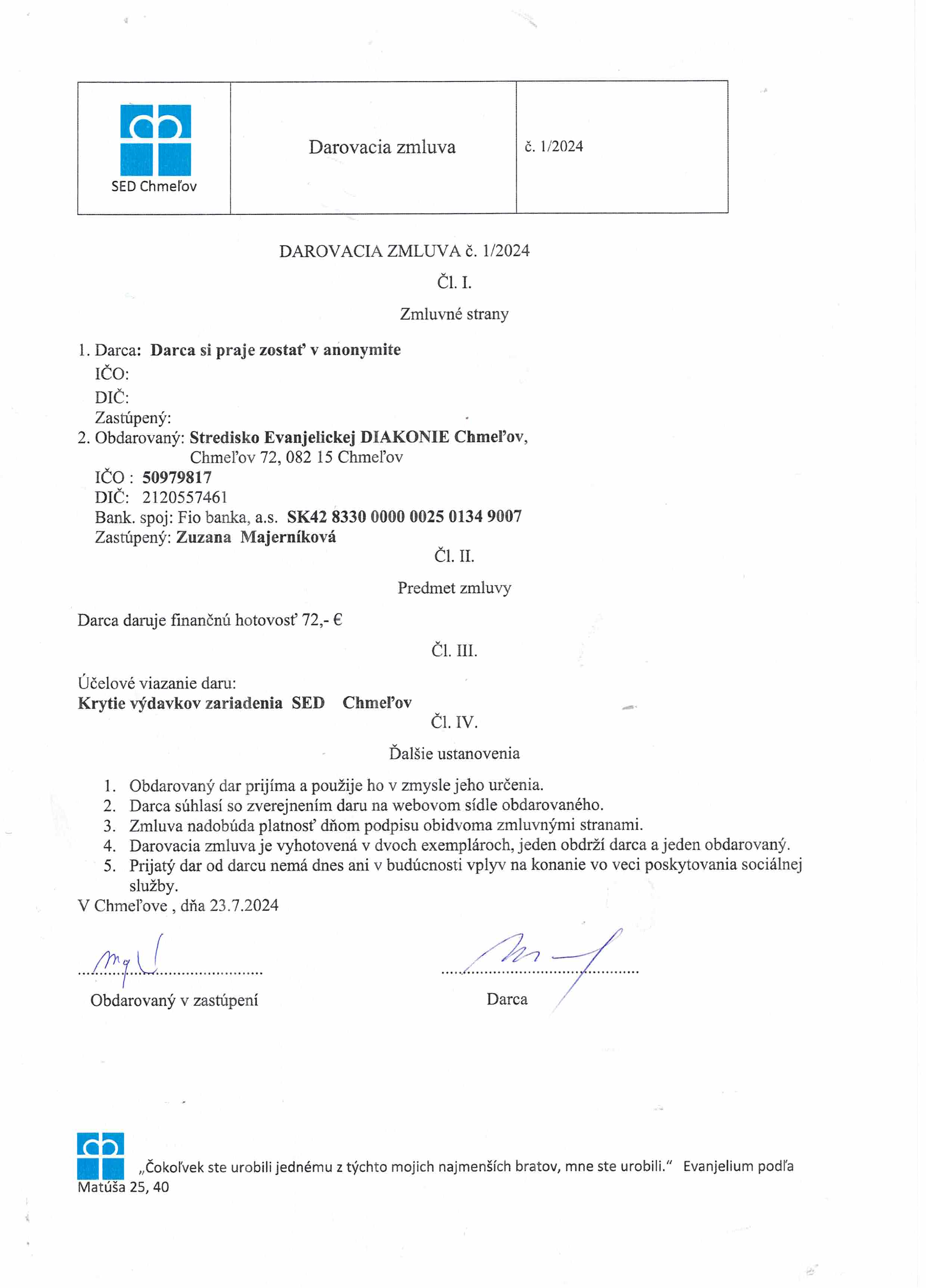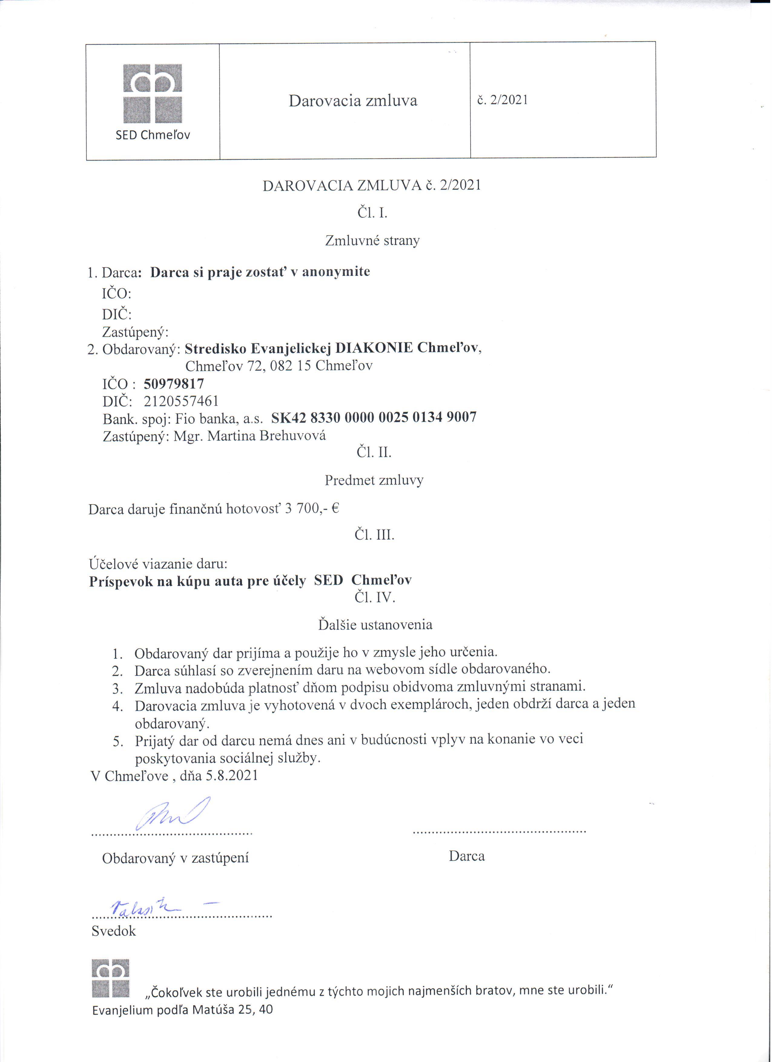 Darovacia zmluva 1/2022 - príspevok na stravu pre PSS