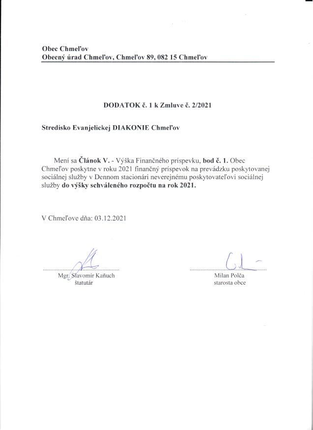 Dodatok č. 1 k zmluve č. 2/2021 s obcou Chmeľov