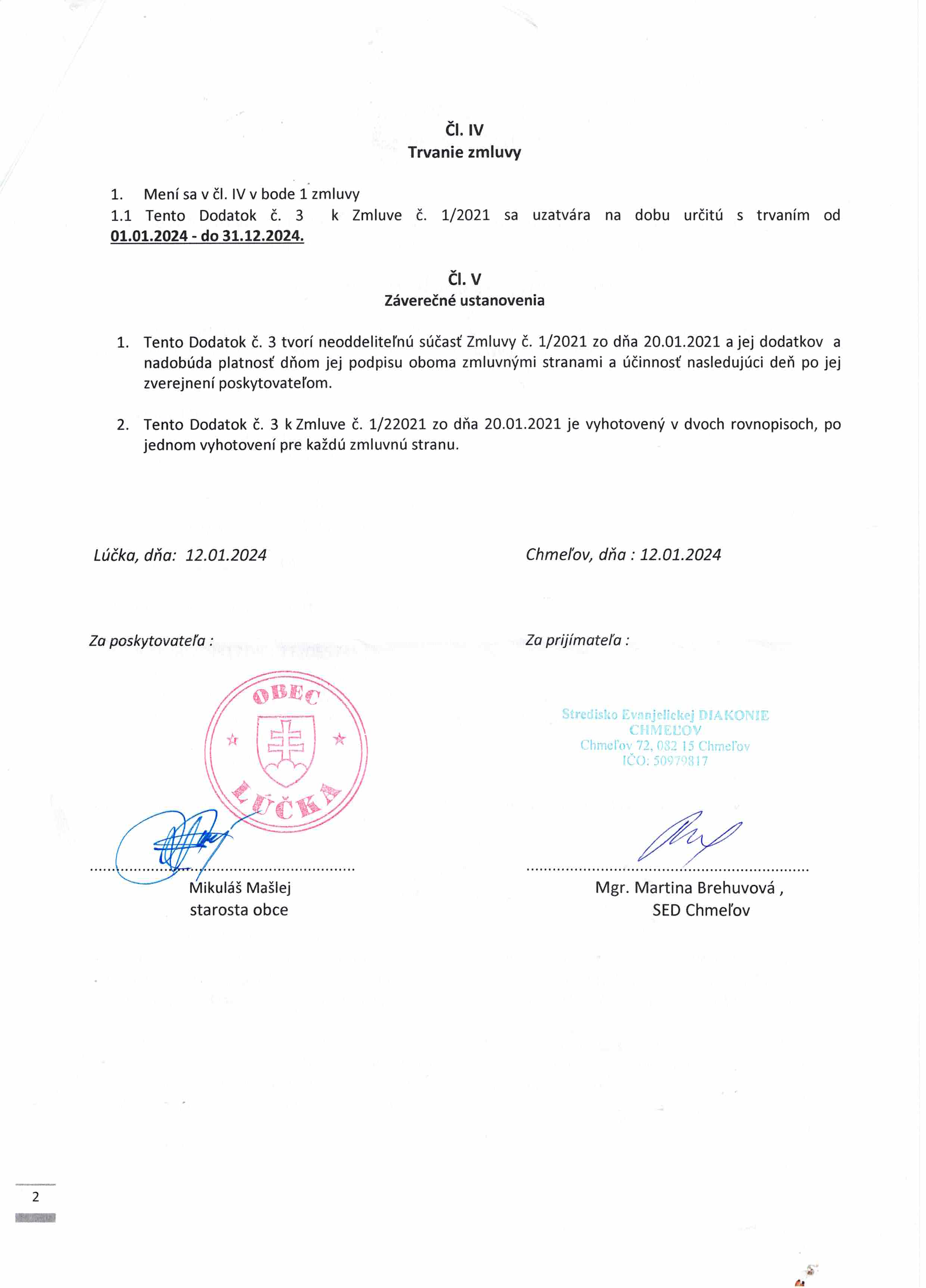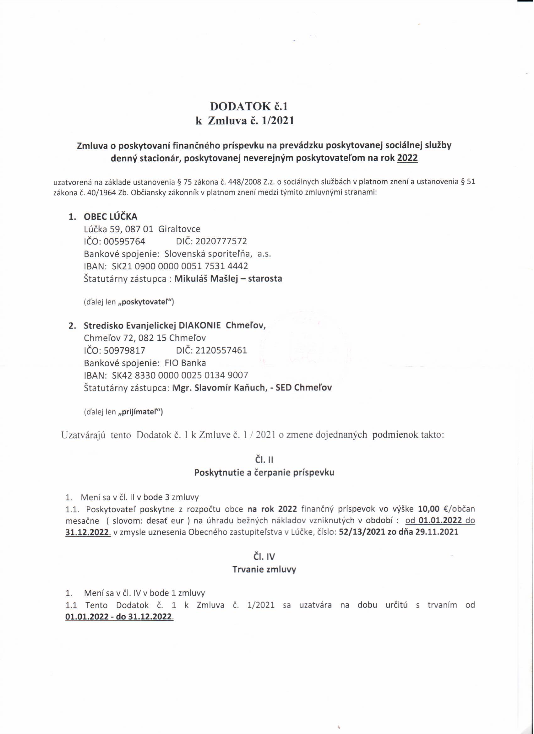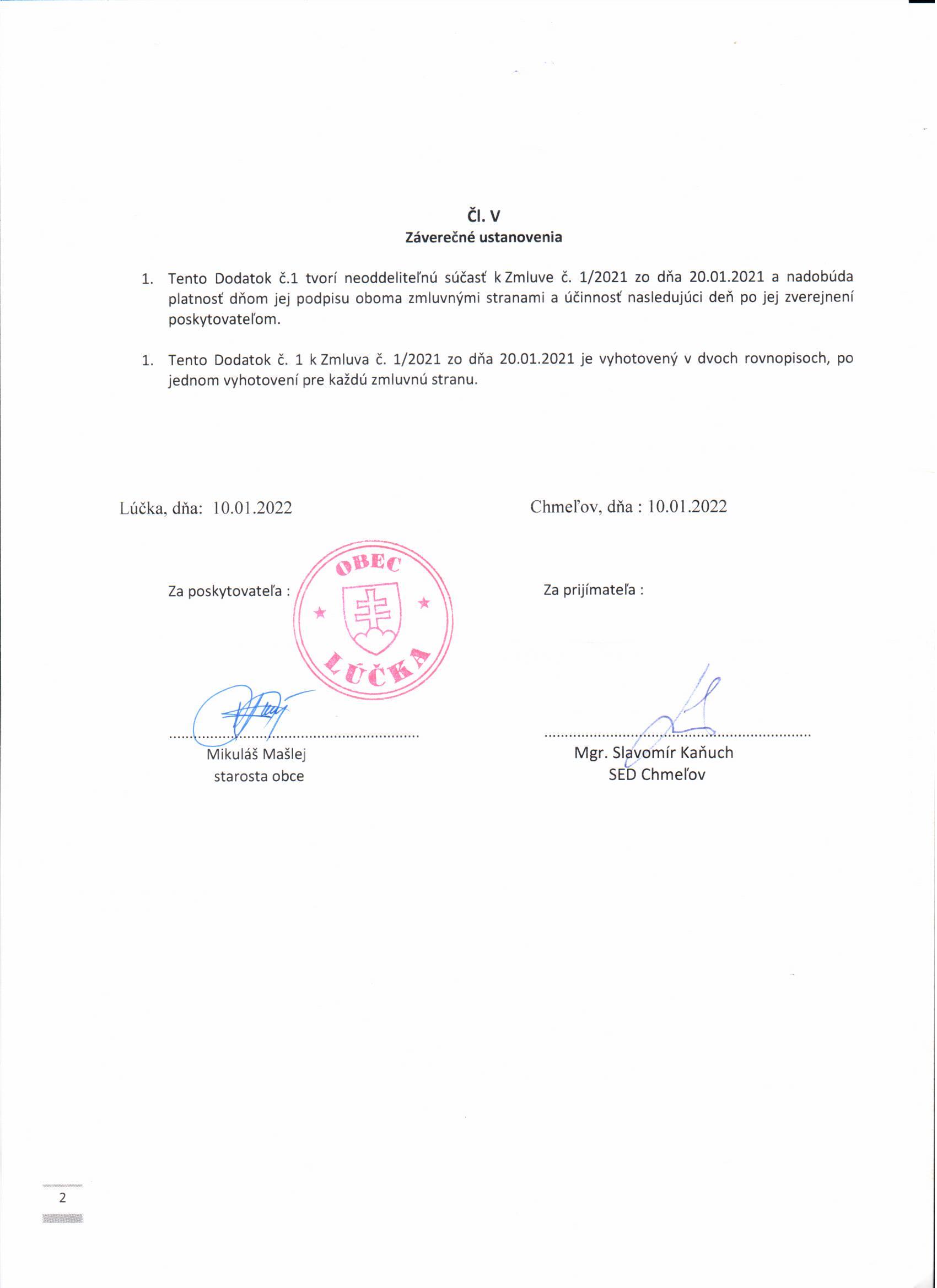 Dodatok č. 2 k zmluve č. 1/2021 o poskytovaní príspevku na prevádzku SS s obcou Lúčka.