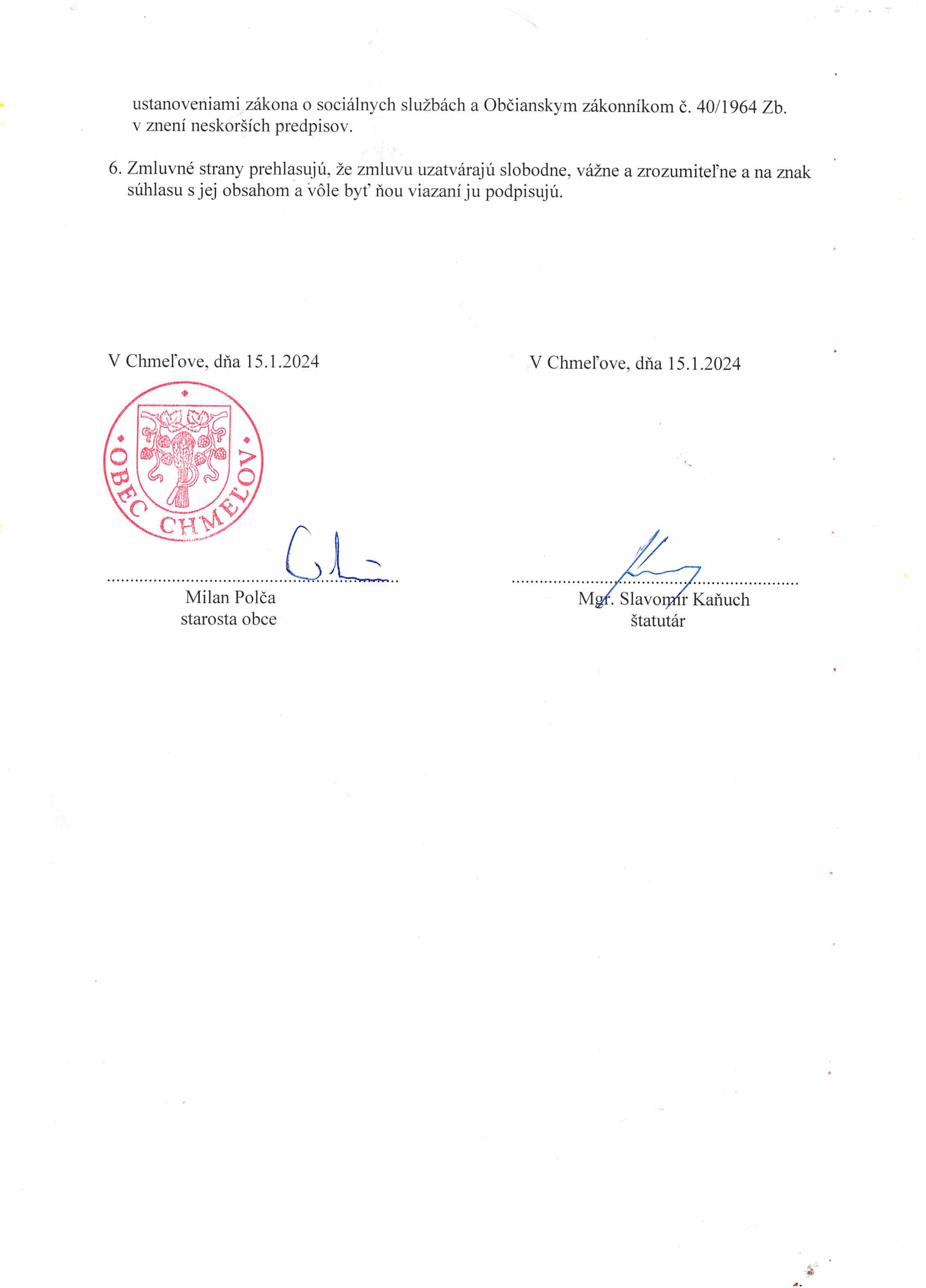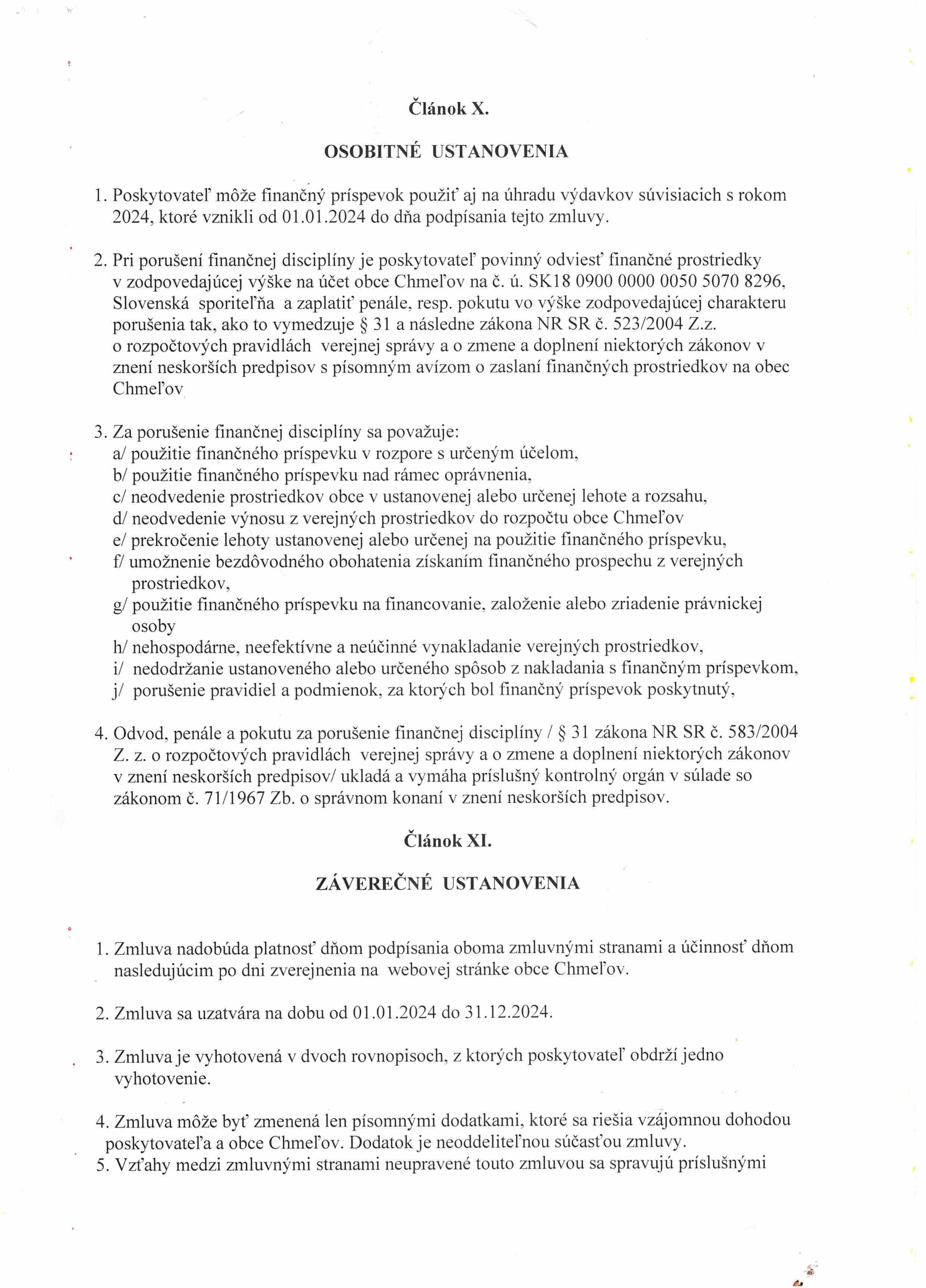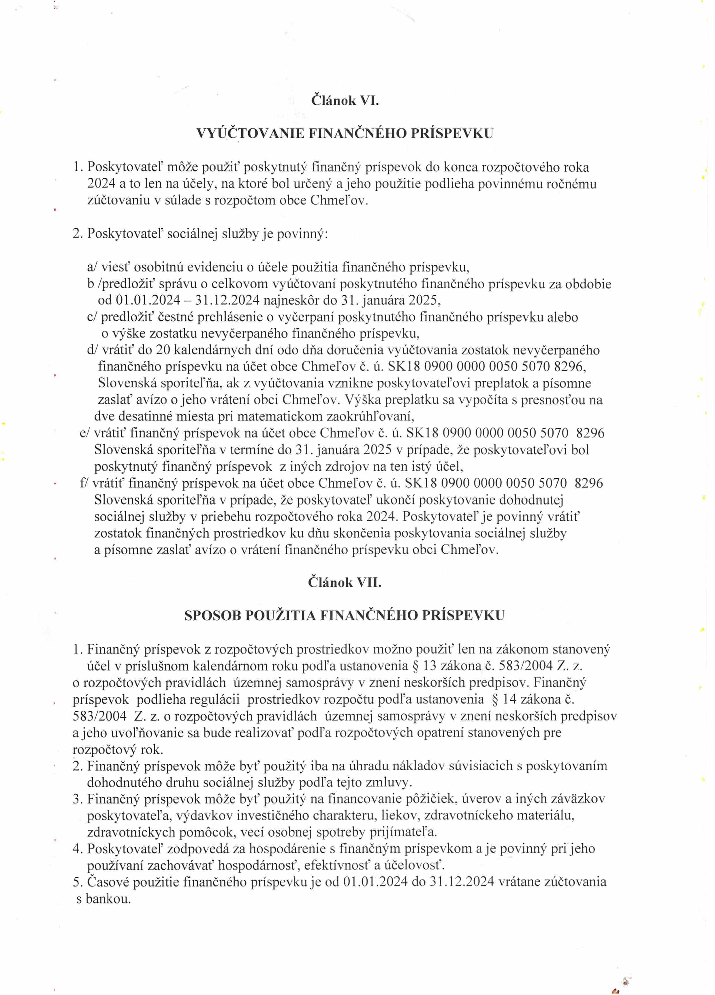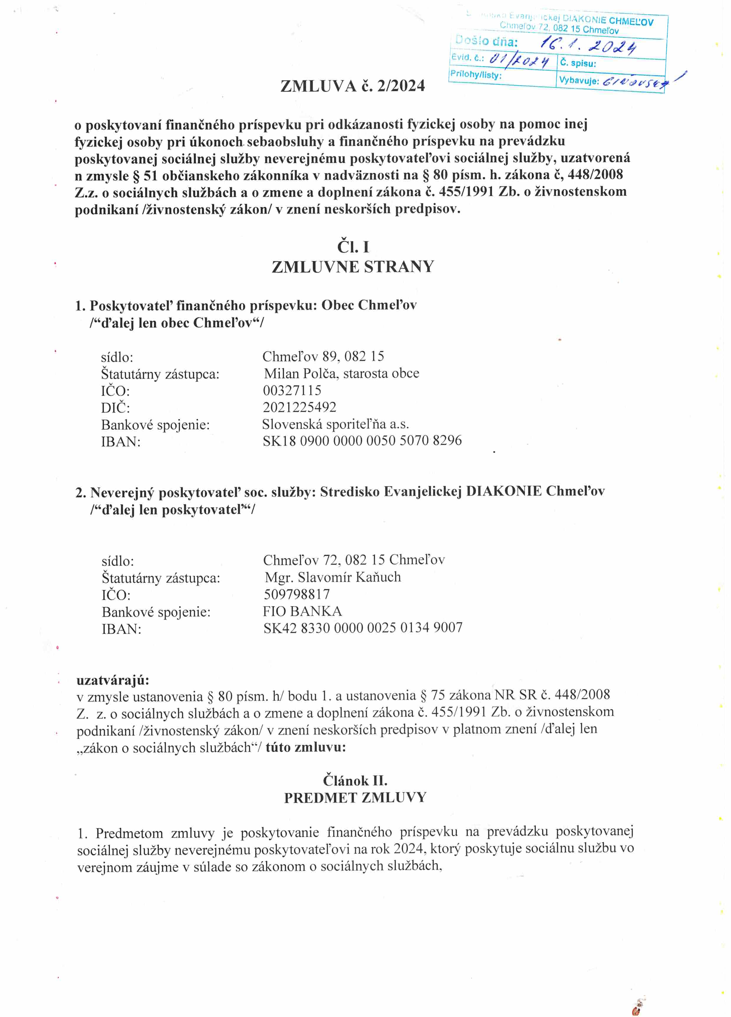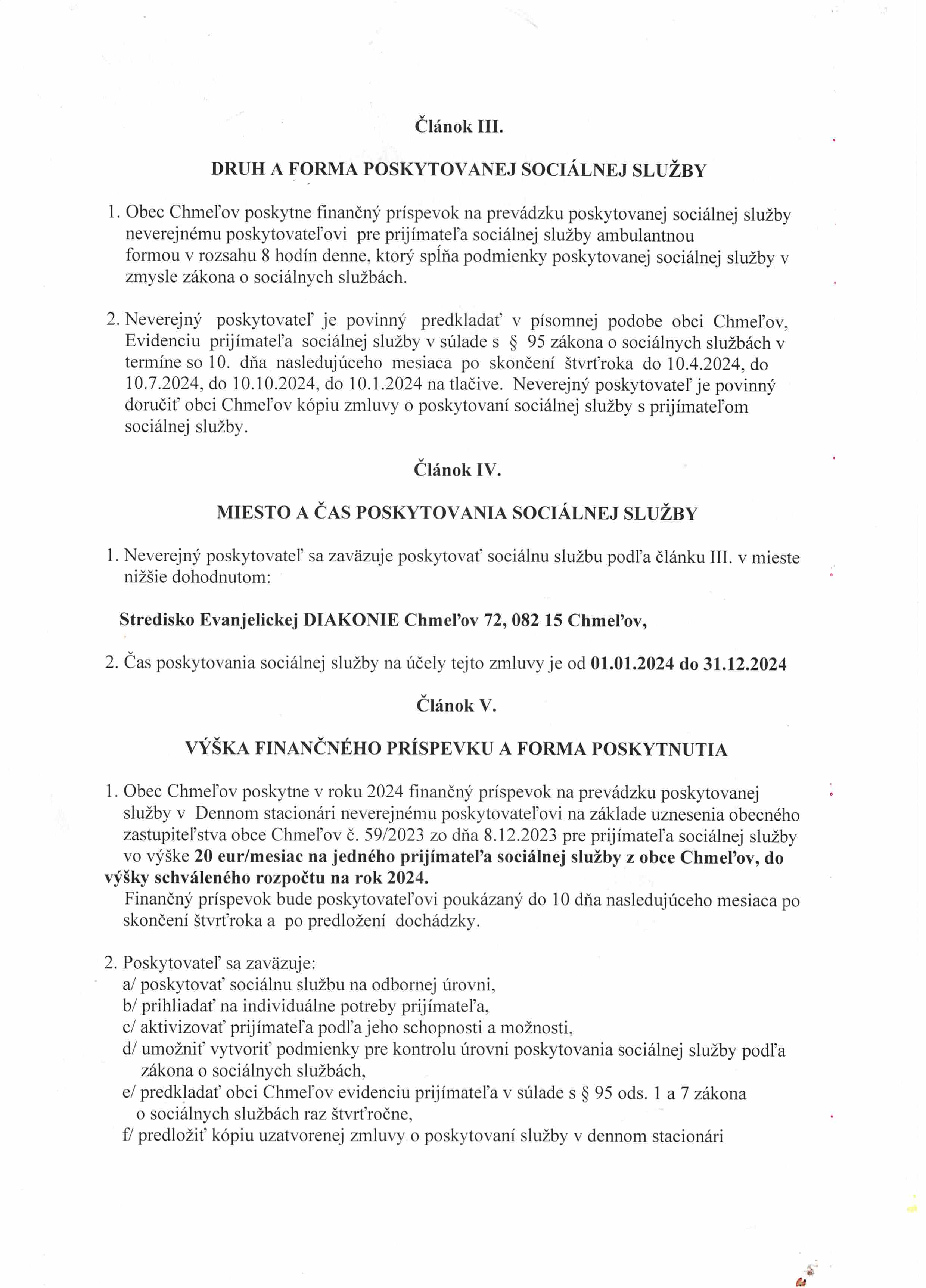 Zmluva č. 2/2024 o poskytovaní príspevku na prevádzku SS s obcou Chmeľov