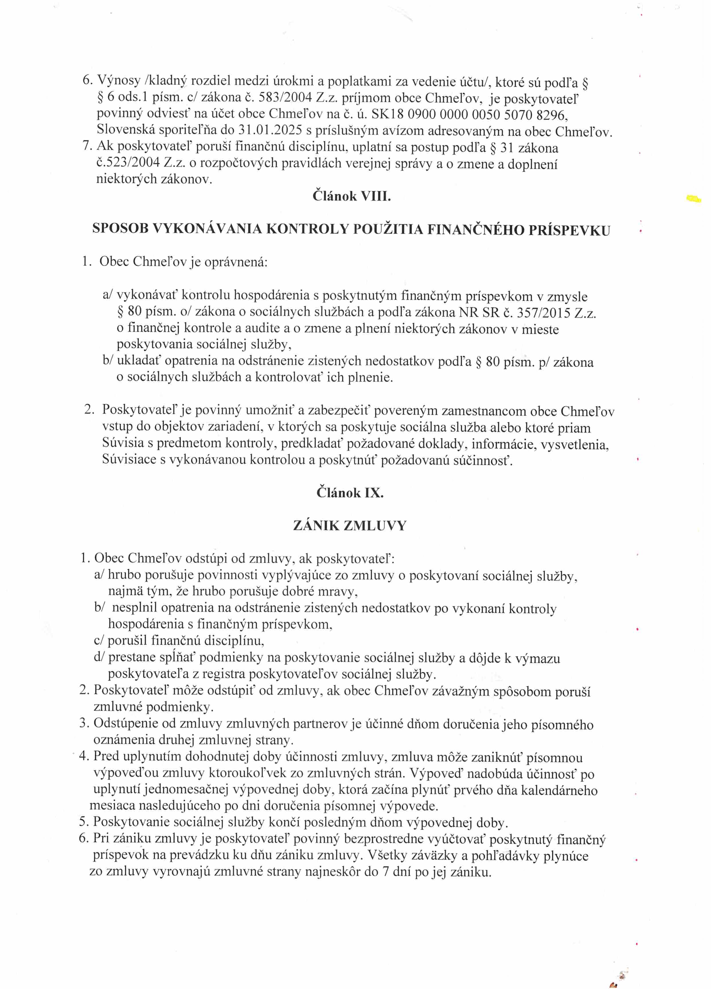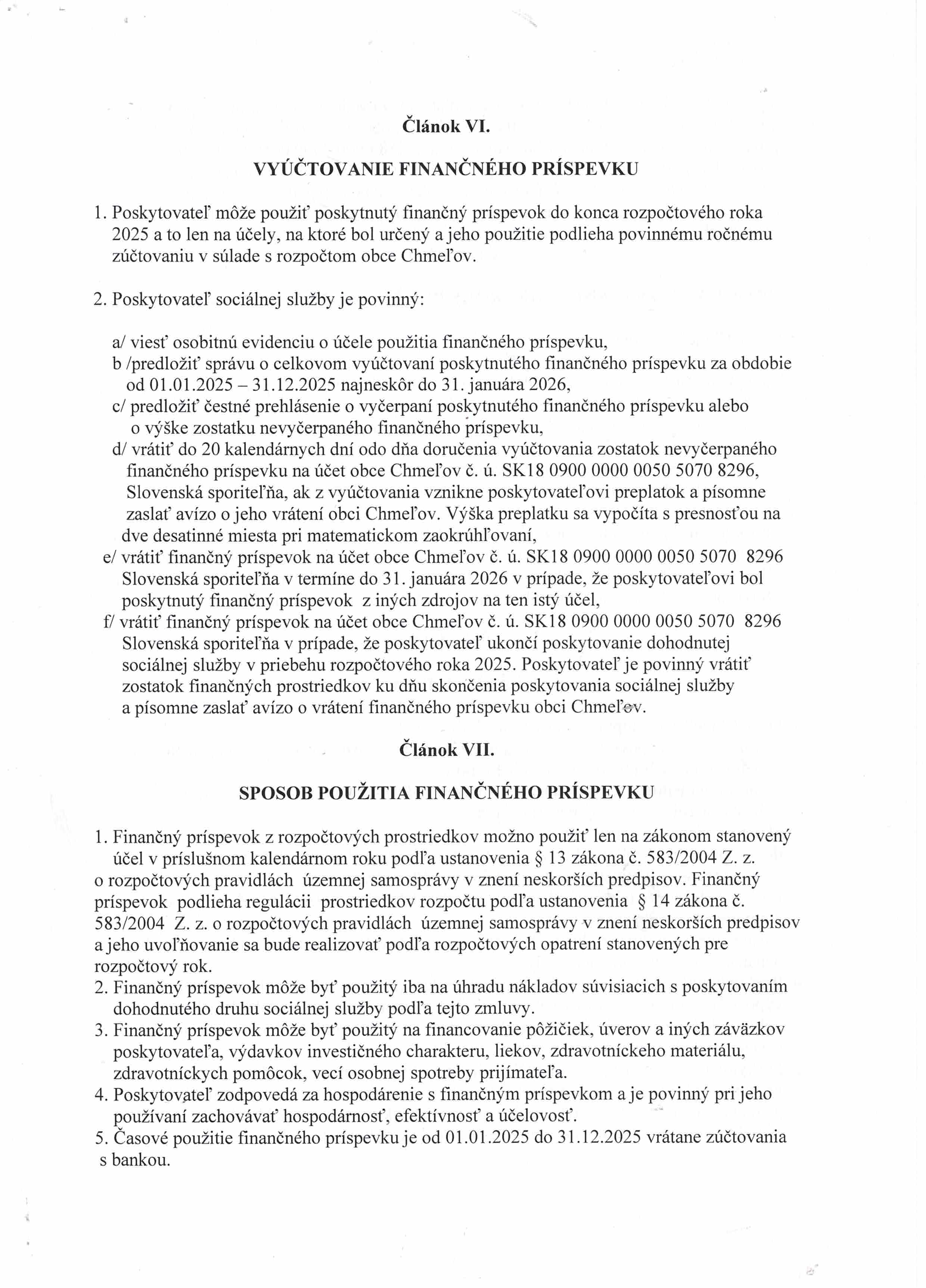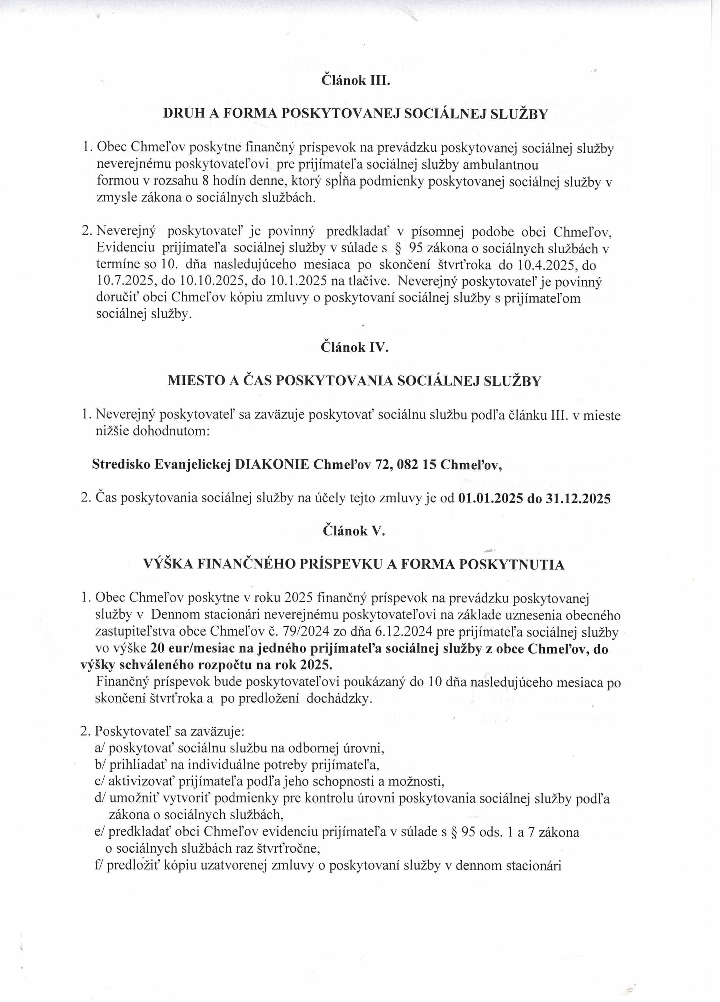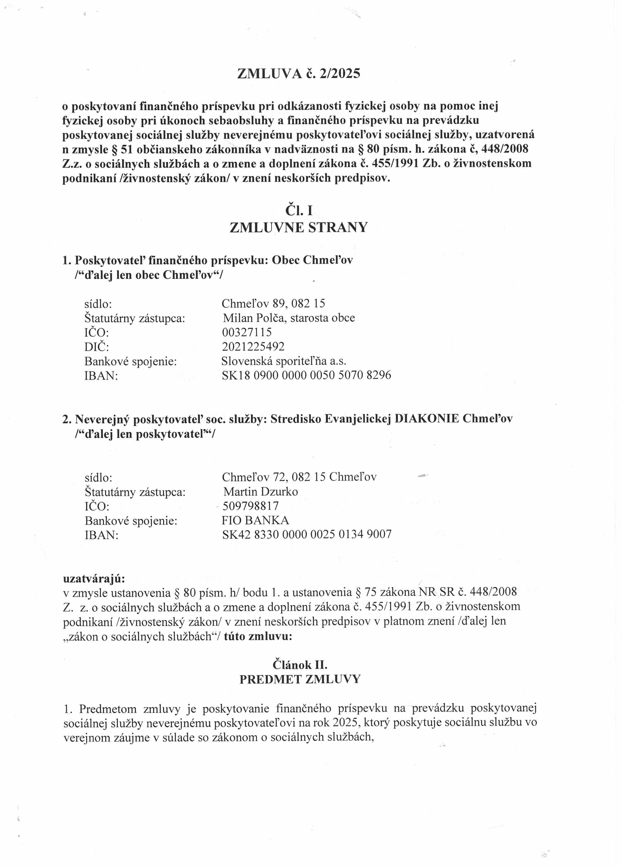 Zmluva č.2/2025 o poskytovaní príspevku na prevádzku SS s obcou Chmeľov
