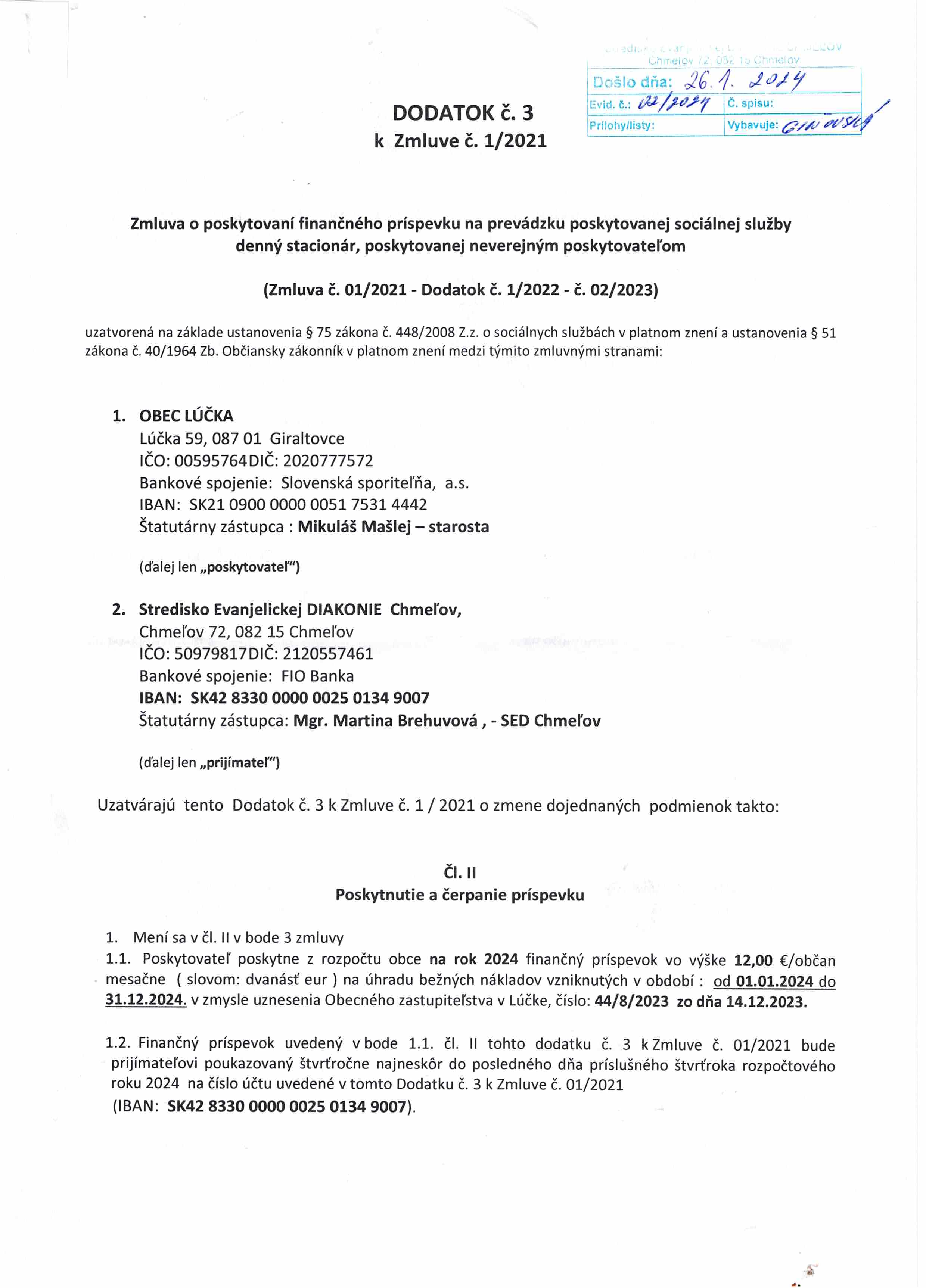 Dodatok č.3 k zmluve č. 1/2021 o poskytovaní príspevku na prevádzku SS s obcou Lúčka